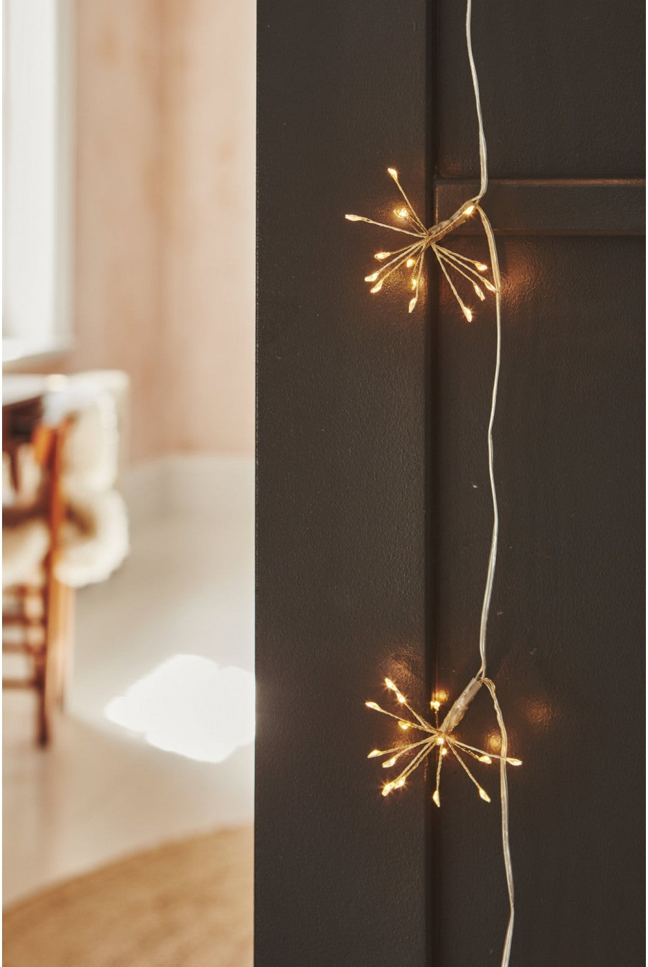 A silver chain of Starburst lights with 240 warm white LED’s with transformer. The string is decorated with 16 ornaments 7cm in size and has an illuminated length of 3m suitable for use indoors or outside. Total length is 6m. Not suitable for young children.
