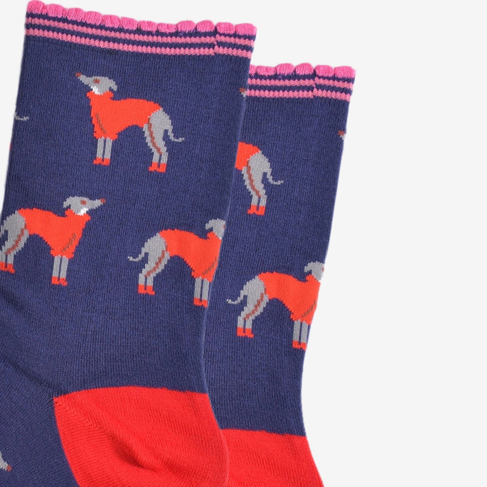 Designed in the UK, these dog socks are crafted from naturally breathable bamboo. A contrasting blue, pink and red design showcasing majestic greyhounds wearing cosy knitted winter jumpers. Featuring a luxuriously comfortable scalloped cuff.